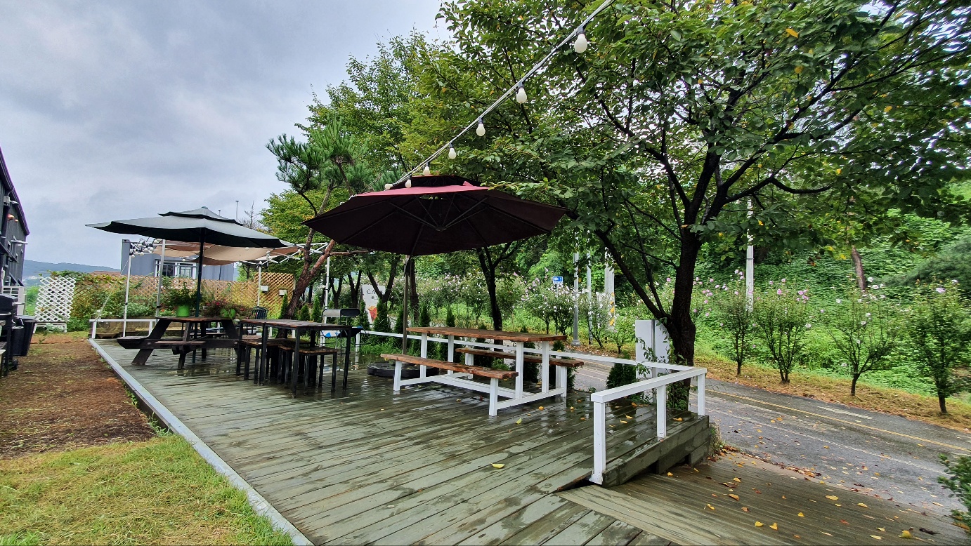 자전거 도로 옆으로 야외테이블이 있는 카페다.